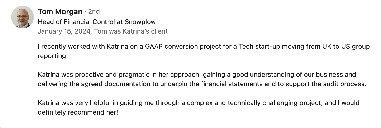 I now consult independently on all aspects around cross-border accounting and IFRS/US GAAP standards, working most recently on a US GAAP conversion for a UK SaaS company and for an Austrian subsidiary of a Fortune 100 company.